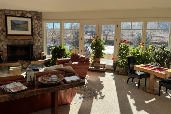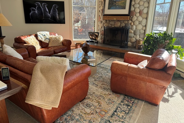 Comfortable living room with wood burning stone fireplace and views of the river